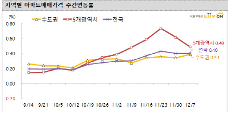 인천을 제외한 5개 광역시(0.35%)는 울산(0.46%), 부산(0.39%), 광주(0.38%), 대구(0.33%), 대전(0.20%) 모두 상승했다.